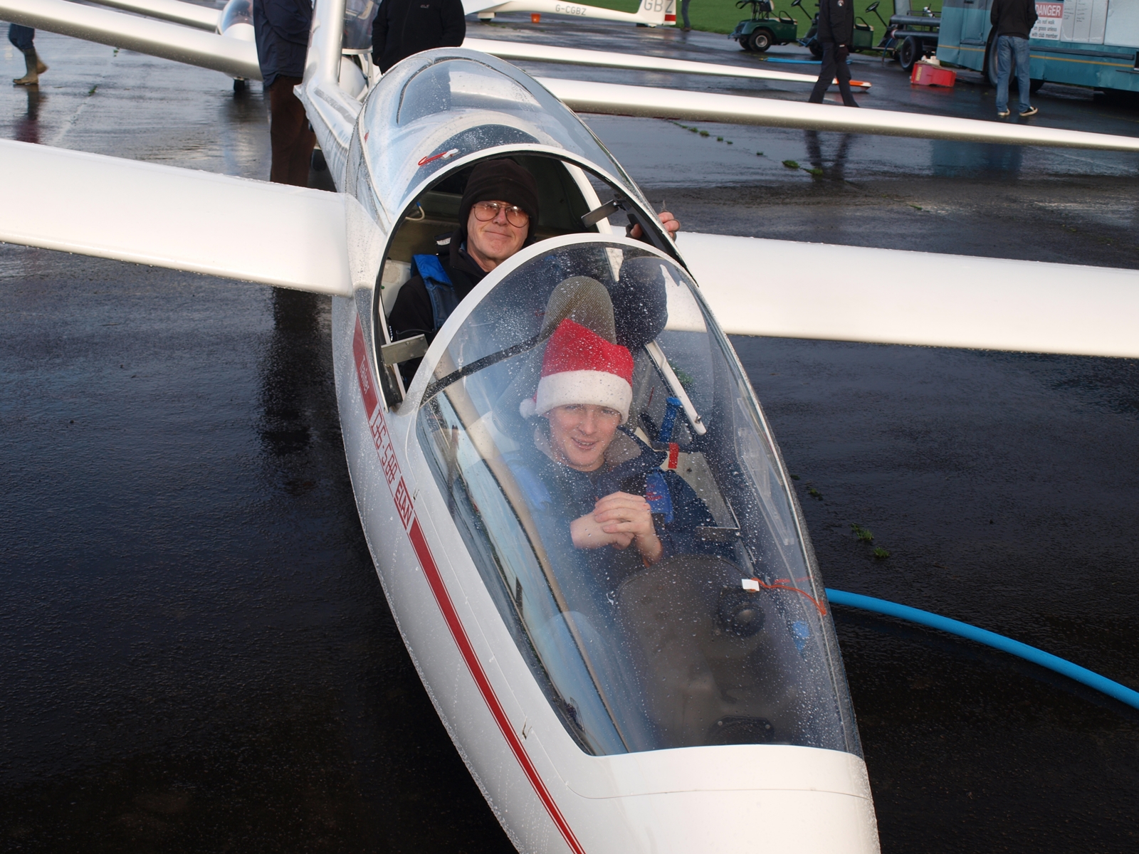 Sunday 20th December - the first flyable weekend day for a very long time. Although the airfield was very squelchy underfoot, sometimes giving the buggies trouble in moving two seaters, we are better placed than some clubs in having hard runways and a well-drained airfield. Many without these advantages couldn't operate after the monsoons of recent weeks.