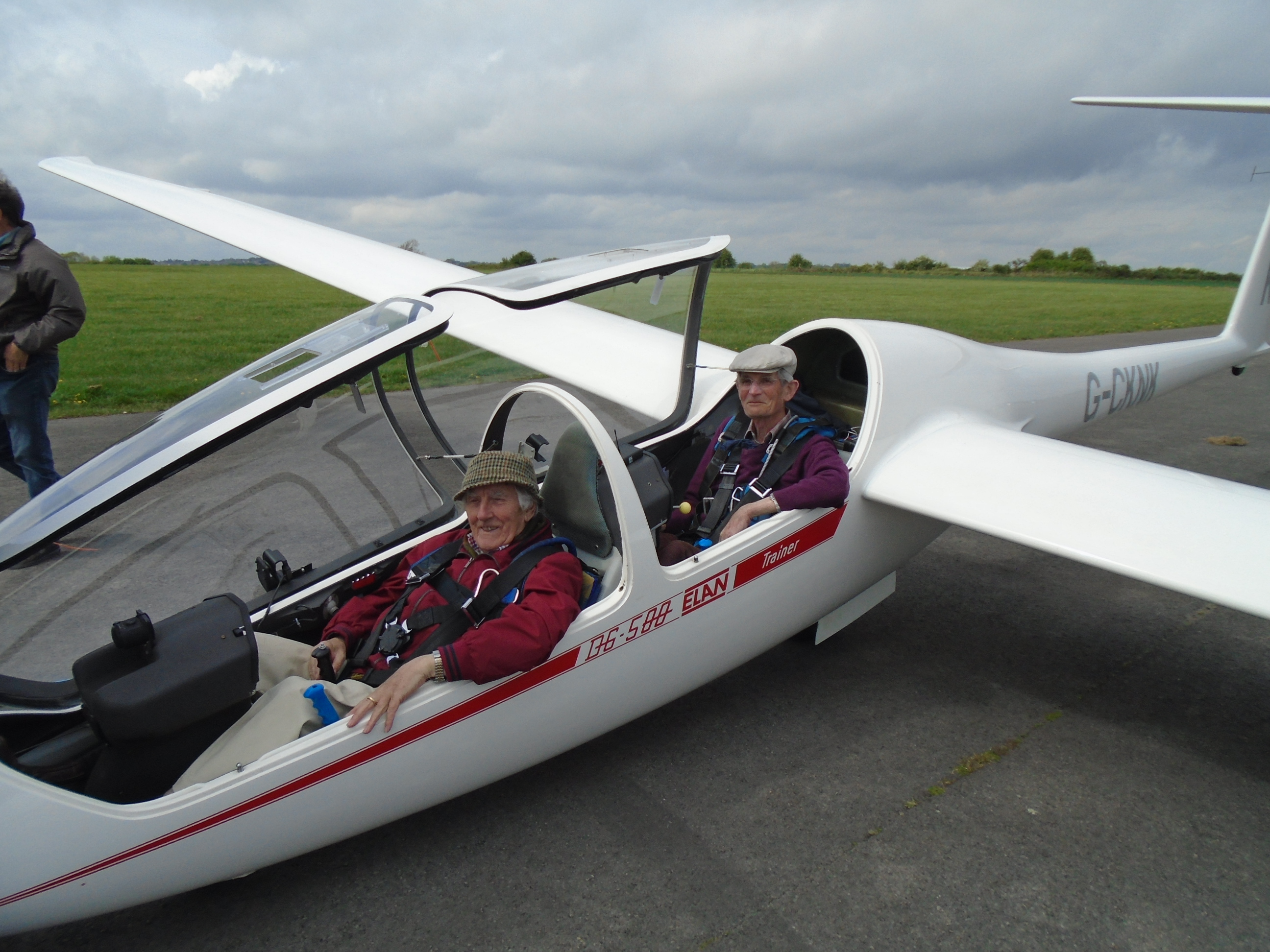 Today was also the second U3A Group day. All six had extended flights in the DG500 with Mike Randle including a former Tornado and Boeing 777 pilot who took the opportunity to do some cloud flying. Afterwards Mike flew with Alan Smith, Lesley's father and former Concorde test pilot who naturally was able to complete the landing in spite of not having flown for 20 years. Lesley observed that there were two Meteor pilots with a combined age of 164 in the cockpit. Picture below.