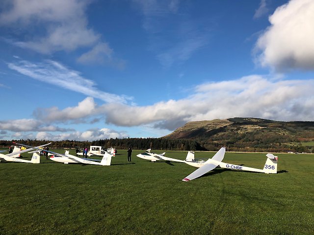 Posted 13-10-19, 13:37 by geoffdixonLight drizzle in the morning dried up at around 11:00 am. From lunch time onwards the cloudbase was around 1200 feet and with 3 two seaters out we were able to give first flights to 7 of our UWE members plus some Géneral instruction and solo flying. The day was made more interesting by having a small scale filming activity going on. Go-Pros used on board the DG500 and as “targets” during some launches and landings. As usual a big thank-you to the dutyman crew who made it all possible.