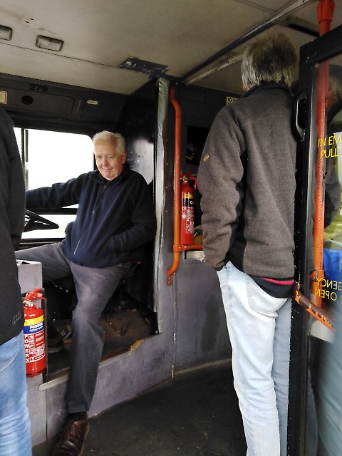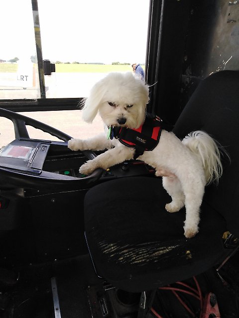 Avro visited us from New Zealand, the happy little dog was content to inspect the driving controls of the bus!