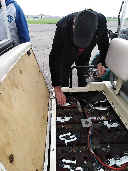 The picture shows Collin checking over the electric buggies batteries, doing the routing check before topping up with distilled water.