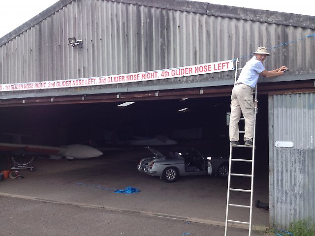 Posted 04-06-17, 10:56 by DGR88In the hope that those members who stay to the end of the day to pack the hangar will still be able to read, here is the guide to hangar packing (south side version; the north side one is the opposite instructions) being put up by John McWilliam. The purpose is to ensure the cockpits of gliders are located close to the battery charging drop-down plugs and cables in the hangar. Objective: all club gliders have fully charged batteries every day.