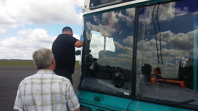 The new windscreen was fitted under the close scrutiny of Richard. When asked for a quote, with a big grin he said "at last!!". It is now no longer necessary to wear goggles while driving the bus.