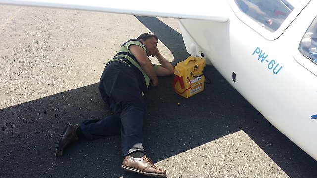 Posted 19-06-15, 17:38 byOff to the hangar after briefing, to discover the main wheel of the PW6 is flat. Mmmmmmmm, lets try pumping it up and see what happens. Bingo its inflated and holding air.